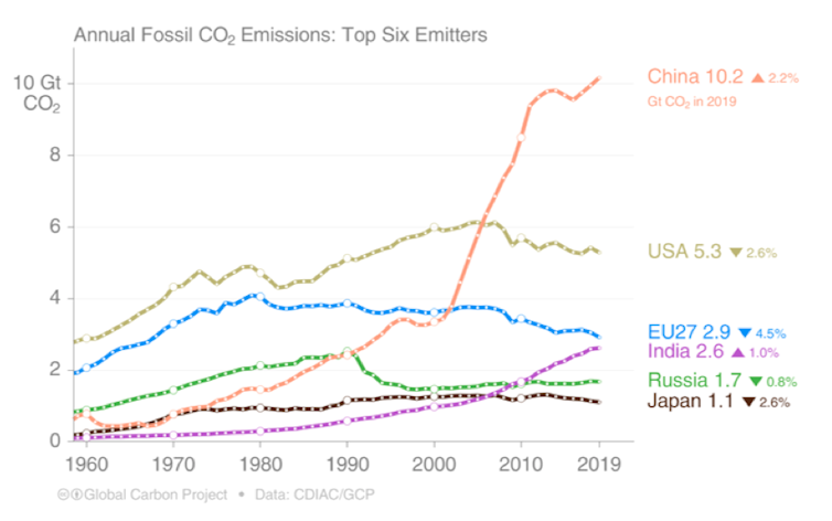 La récente édition du Global Carbon Budget donne une image complète de ces empreintes territoriales dans le monde jusqu’en 2019. Cette année-là, les rejets de CO2 dans l’atmosphère résultant de l’usage d’énergie fossile et de procédés industriels ont atteint 36,4 gigatonnes de CO2, soit 4,7 tonnes par habitant : ce qu’on émet en produisant 3 tonnes d’acier ou en roulant 20 000 km dans une voiture de moyenne gamme. Les quatre premiers émetteurs – Chine, États-Unis, Union européenne, Inde – contribuent pour un peu plus de 60 % à ces rejets, mais connaissent des évolutions contrastées.