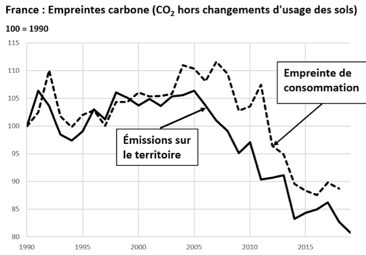 L’empreinte de consommation recense les émissions résultant de l’usage des biens et services dans une économie. Pour la calculer, il convient de corriger les émissions observées sur le territoire des effets du commerce extérieur : celles induites par les importations de biens et services émetteurs de CO2 doivent être ajoutées ; celles incluses dans les exportations doivent être retranchées.